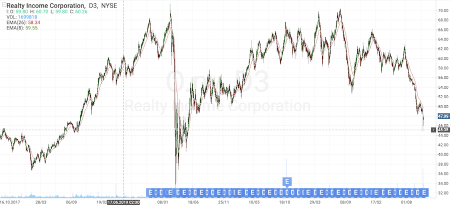 С начала 2023 года акции O.ny торговались в боковике между 68$ и 58$. Однако в августе 2023 года курс пробил уровень поддержки в 58$ вниз и акции упали до 45$.
