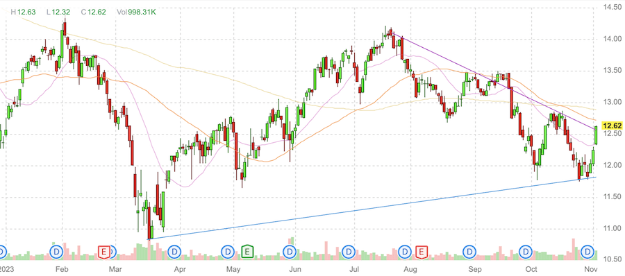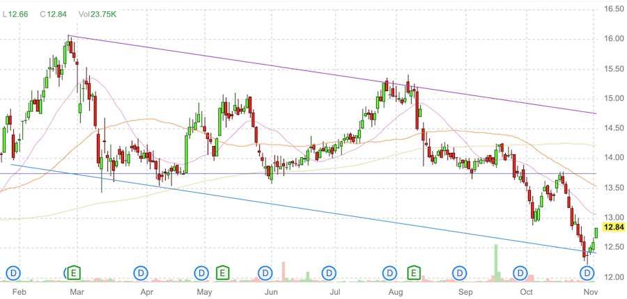 Благодаря высокой дивидендной доходности и не прекратившейся выплате дивидендов акции Ellington Financial (EFC) постепенно вернулись к докризисному уровню и сейчас торгуются у верхних границ вытянутого треугольника.