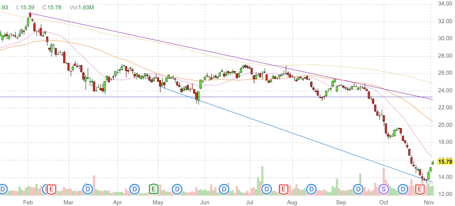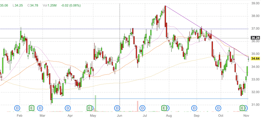 Совсем недавно акции STAG оттолкнулись от уровня поддержки на 31,5$-31,75$ подошли к верхней границе краткосрочного нисходящего канала. Если удастся закрепиться выше 35$, то следующая цель 37$.