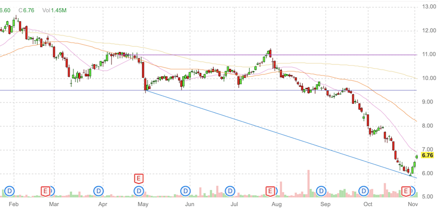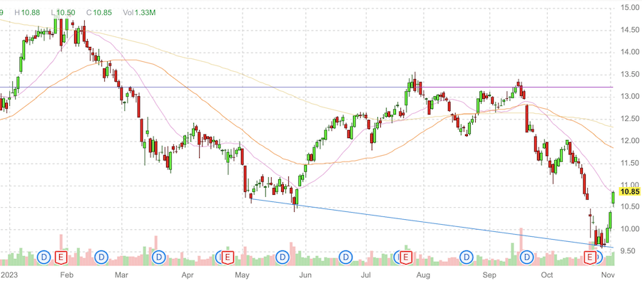С февряля 2023 года акции торгуются в нисходящем тренде, c коррекцией перед отчетом. Сейчас курс подошел с уровню поддержки на 8,20$. Если падение продолжится и цена закрепится ниже этого уровня, то падение продолжится до 7$.