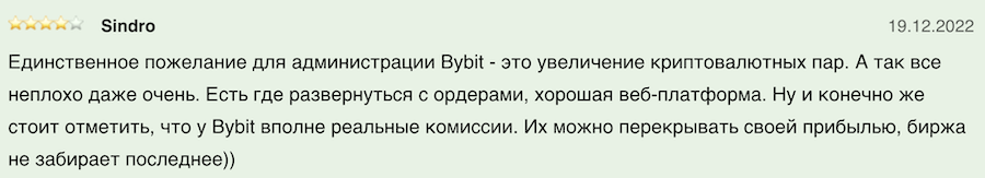 Понравилось как работает техническая поддержка. Был горький опыт, когда игнорируют больше суток и в итоге совсем не отвечают, но это не про Байбит — на вопрос о переводе криптовалюты ответили и решили проблему в течение 15 минут.