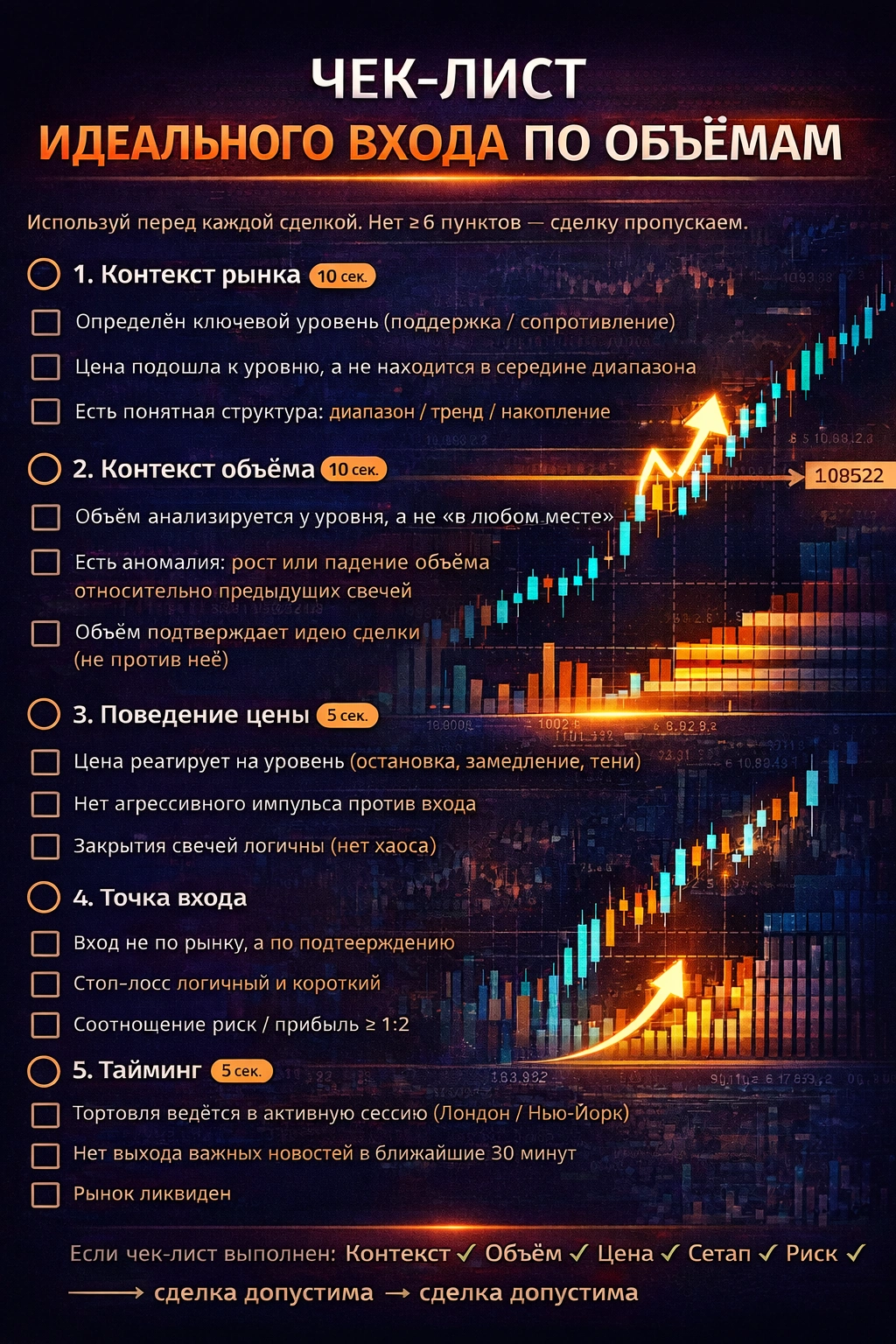 В целом объёмный анализ в трейдинге — это не очередной индикатор и не «секретная стратегия». Это способ видеть рынок таким, каким его видят крупные участники, а не гадать направление по случайным сигналам. Его сила проявляется только в условиях реальной ликвидности, реального исполнения и реальных рыночных реакций. Именно поэтому выбор брокера здесь критически важен. И помните — рынок не обязан давать вам прибыль. Но он всегда показывает, где в него входят деньги. Ваша задача — научиться это видеть и действовать. Заберите чек-лист входа в сделку при торговле по объемам.