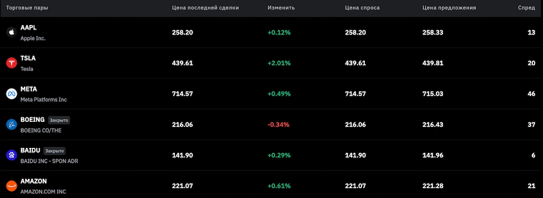 Полный список доступен на сайте биржи. Кроме акций, некоторые платформы предлагают токенизированные ETF и индексы (например, S&P 500 или Nasdaq 100).